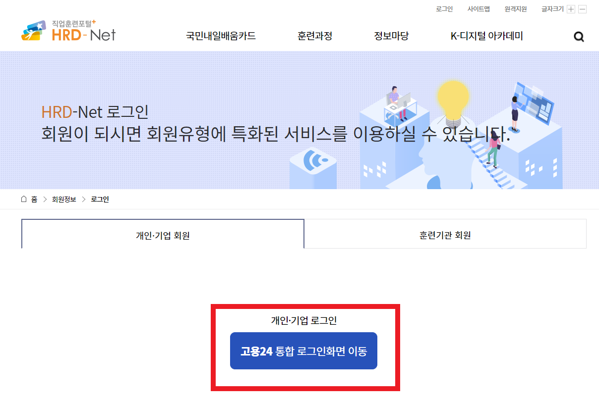 2. 고용24 통합 로그인 화면 이동 클릭 합니다.
