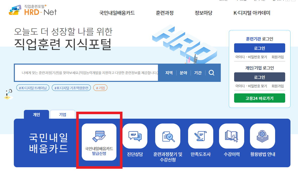1. 사이트 접속 후 국민 내일배움카드 발급신청을 클릭합니다.
