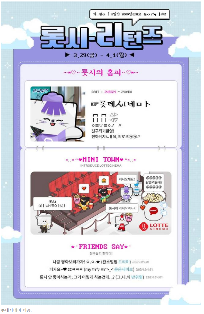 롯데시네마가 만우절 기념으로 '롯시-리턴즈'라는 이벤트를 진행합니다. 롯데 시네마 모바일 앱과 온라인에서 2000년대 말투로 댓글을 작성하는 이벤트라고 합니다. 참가지 전원에게 영화 7000원 할인권 4매를 지급합니다. 또한, 추첨을 통해 레트로 콘셉트의 경품도 제공합니다.