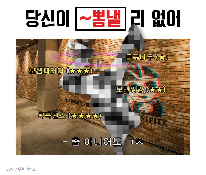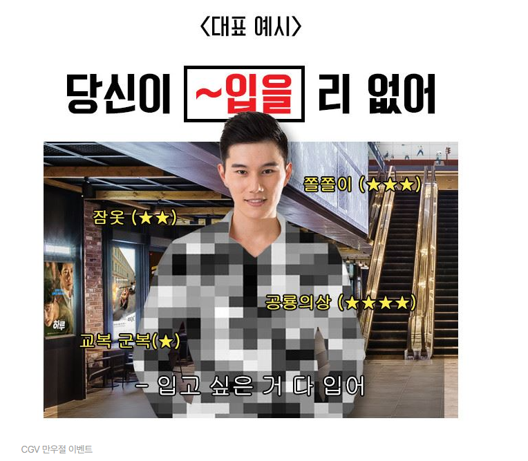 CGV는 1. 잠옷, 군복 등 극장을 올 때 입지 않을 것 같은 의상으로 온다. 2. 물구나무, 댄스 등 이색적인 행동을 한다. 3. 역기나 집문서 등 극장에 어울리지 않은 소품을 가져온다. 와 같은 이벤트 참여 예시를 들었습니다.