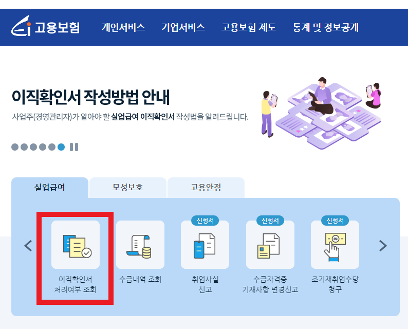 고용보험 홈페이지 '조회'에서 이직확인서 처리 여부 조회가 가능합니다. 아래에서 확인하세요.