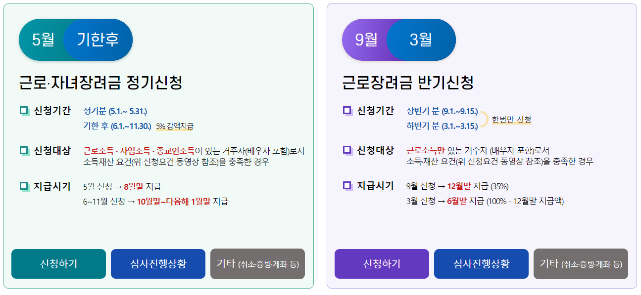 근로 장려금은 저소득 근로자 및 사업자 가구를 대상으로 실질적인 경제 지원을 주는 제도입니다. 1인 가구 최대 165만 원, 맞벌이 가구 최대 330만 원까지 지원을 합니다. 어려운 시기 자격이 되시는 분들은 꼭 신청하셔서 지원받으시기 바랍니다.